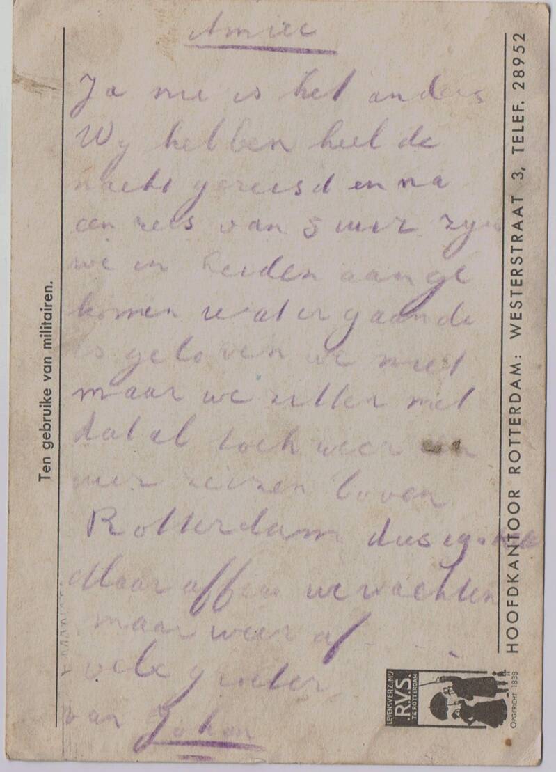 Dezelfde dag ook nog: "Ik weet niet of de post aankomt, want ik hoor niets. Maar ik zal toch het een en ander schrijven. Ik ben nog steeds goed gezond en dat hoop ik ook van u. Maar toch wordt de toestand steeds slechter. Hoe is het? Is Willem nog steeds in gezonde toestand. Maar wat zal er gebeuren. Wie weet, we zullen maar hopen. Maar hier zitten we nog niet erg veilig. Want er is een geweldige druk van de NSB. Veel groeten van Johan. Ik schrijf wel nader. Tot ziens. Daaaaag." Broer Willem was ook in dienst, maar ergens anders.